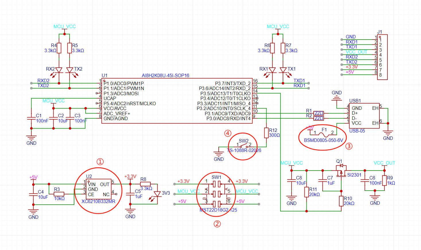 笔者今天要介绍的这三款板子,采用的是AI8H2K08U-45I-SOP16这颗芯片,首先,我们要介绍的是USB转2路UART的这款板子: