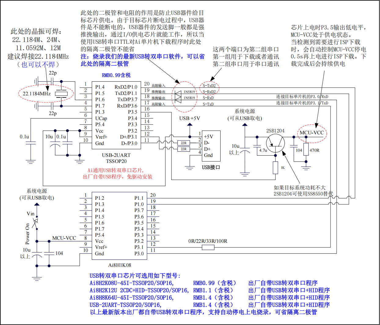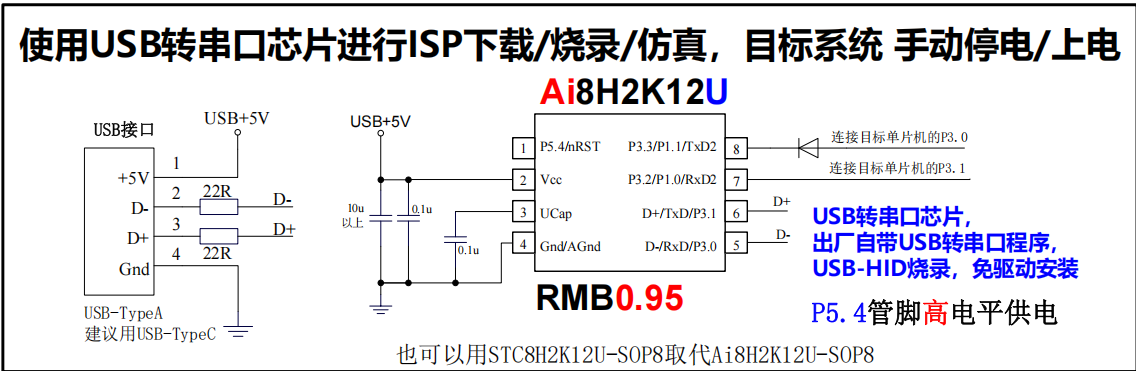 不过,从官方手册上来看,AI8H2K08U-45I-SOP16用于USB转485应用的话,貌似没有专门的方向控制引脚,这一点有点美中不足,要用在该应用上的话,有以下几种选择: