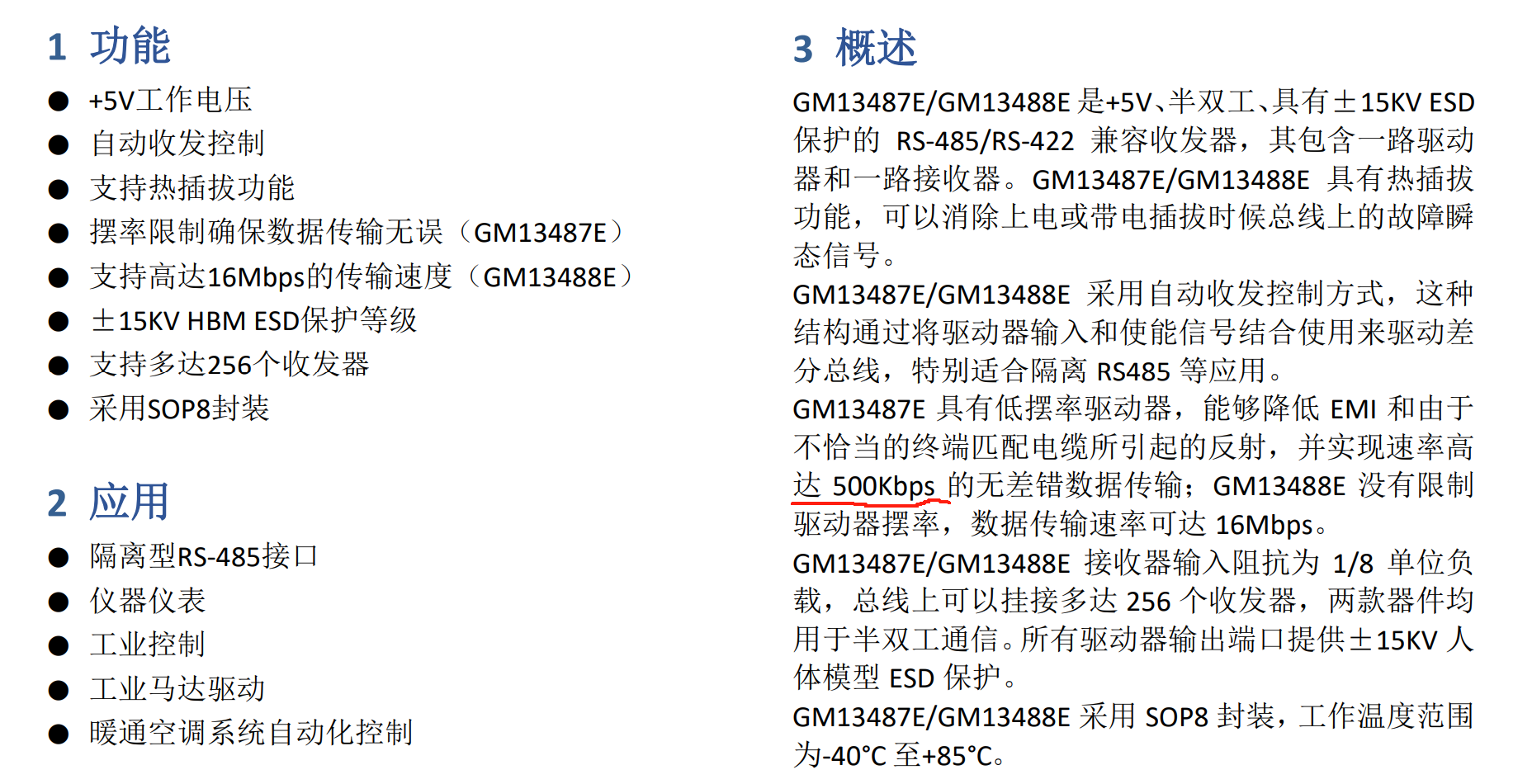 笔者选用的是第3种方式,使用了自动换向的GM13487E,当然咯,这颗芯片的价格也不算便宜,也要2块多大洋一颗。不过,使用简单,而且支持的通讯波特率也要比485的自动换向电路要高很多[手册上标注最高波特率可达500Kbps,实测短距离传输可以达到更高]。
