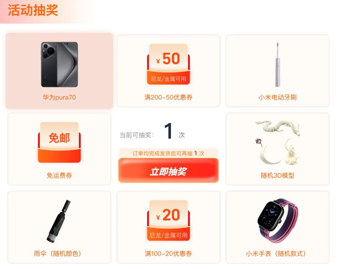 20元能抽中什么礼品?那可多了!奖品包含电动牙刷、运动手表,甚至...华为手机!活动限时开启,快来把科技与好运一起打印进订单~