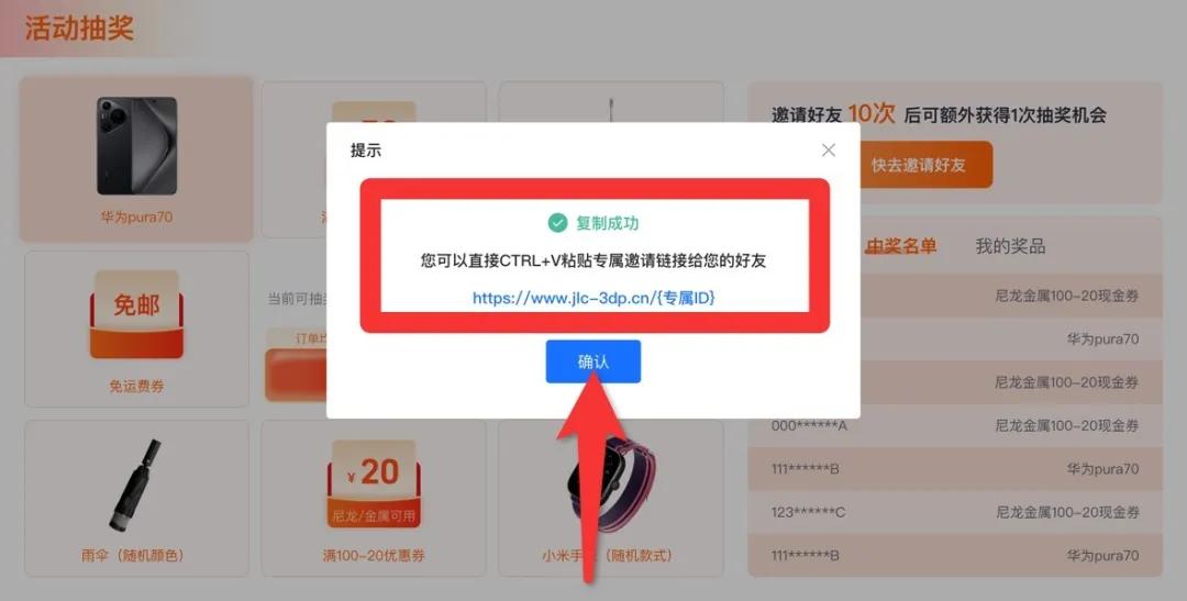活动期间,在嘉立创3D打印官方平台下单(可单笔或多笔累计),所有订单完成发货后,系统将自动累计金额并发放相应的抽奖次数。