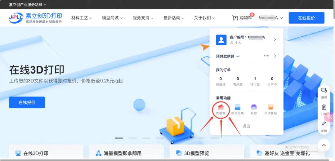 (1)优惠券中奖后,将自动发放至您的账户,可通过“常用功能-优惠券”页面查看;