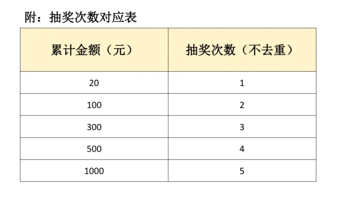 示例:若您已累计消费20元,再下单实付80元满100元,即可获得2次抽奖机会(原先1次+新增1次)!
