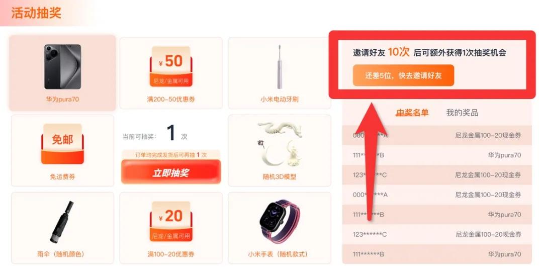 转发活动专属链接给好友,成功分享10次(好友点击链接并登录后即算成功),可免费获得1次抽奖机会!