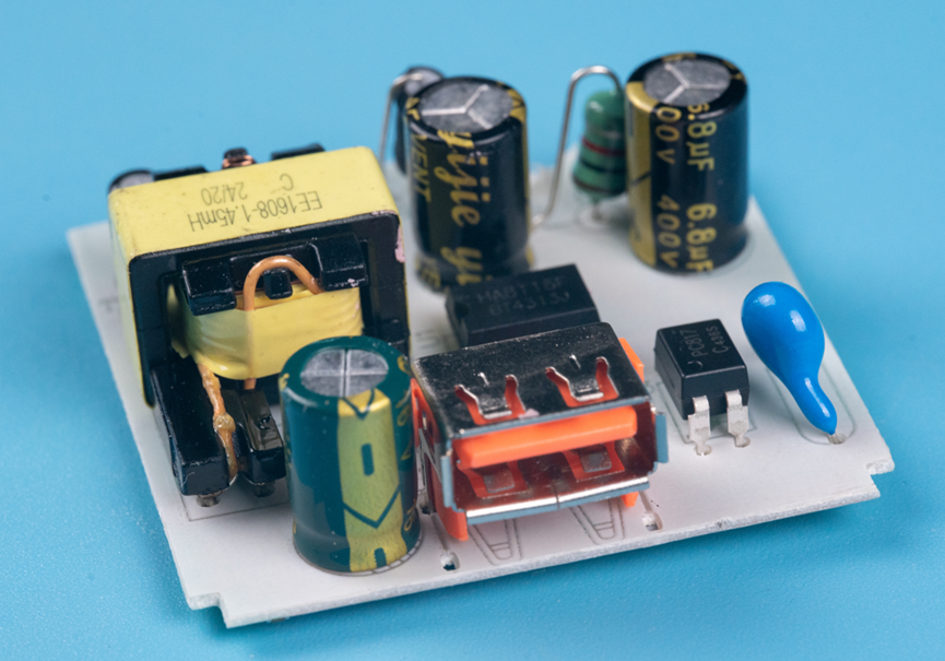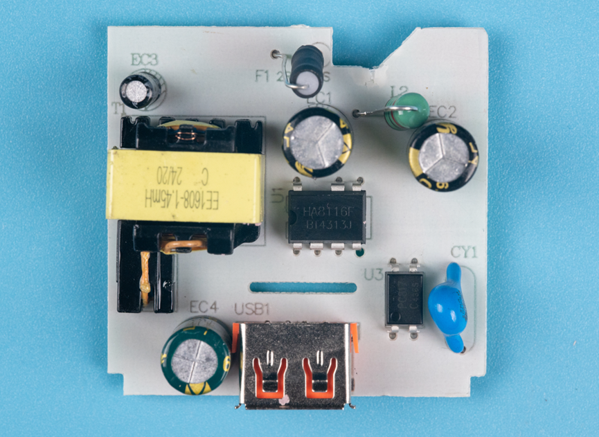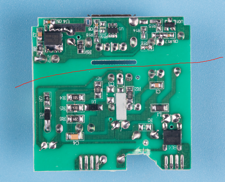 去掉橡皮泥之后,板子上是这样的。这就是一个正常的,普通的,做工一般的一个电源适配器。你说他能输出5V2A我是相信的,但是你要在说他能输出66W,那我要上大嘴巴子抽丫的。