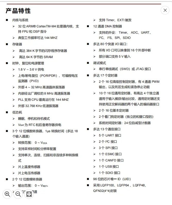 ⚫ 封装采用 LQFP100、LQFP64、LQFP48 和 QFN32