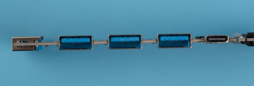 侧面三个USB3.0接口,尾端还有一个USB3.0接口。