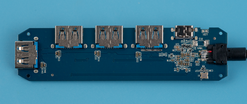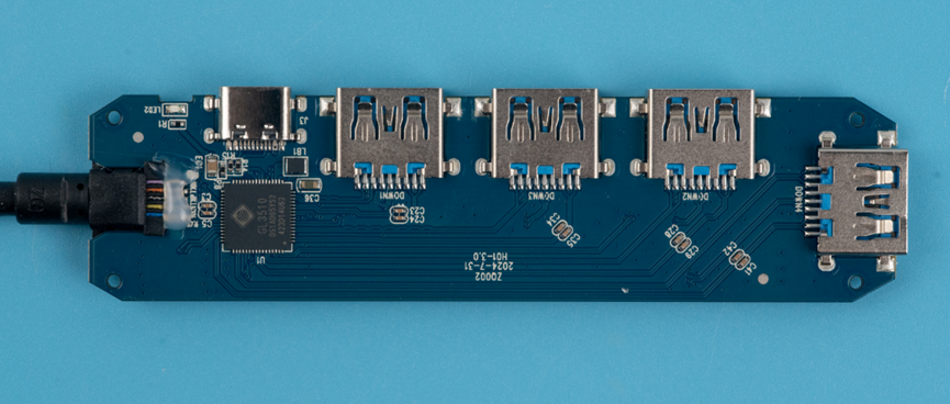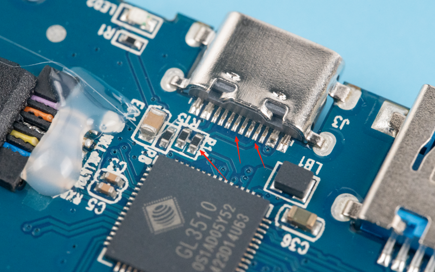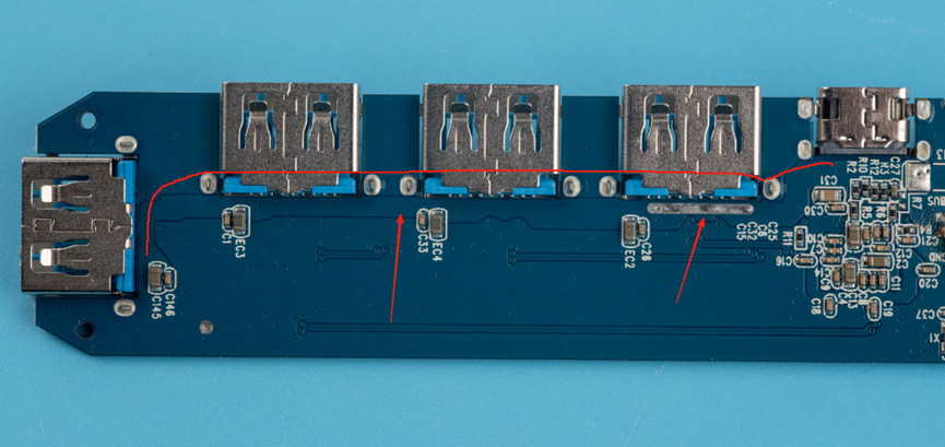 给GL3510芯片来个特写。最上面的一组连接到USB线材,是上行接口,走位的其他走线走到下面的,到了四个USB3.0扩展口,是下行接口。
