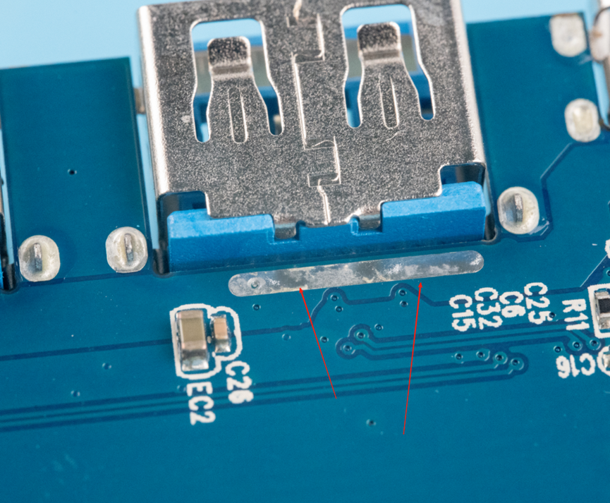 背面的电源铜皮,在第一个USB3.0连接器处变细了,所以给铜皮上面做了开窗,这样的好处是:SMT焊接时,可以给上面刷一层锡膏,进回流焊炉之后,这层锡膏融化,导电厚度变厚,过流能力增强。