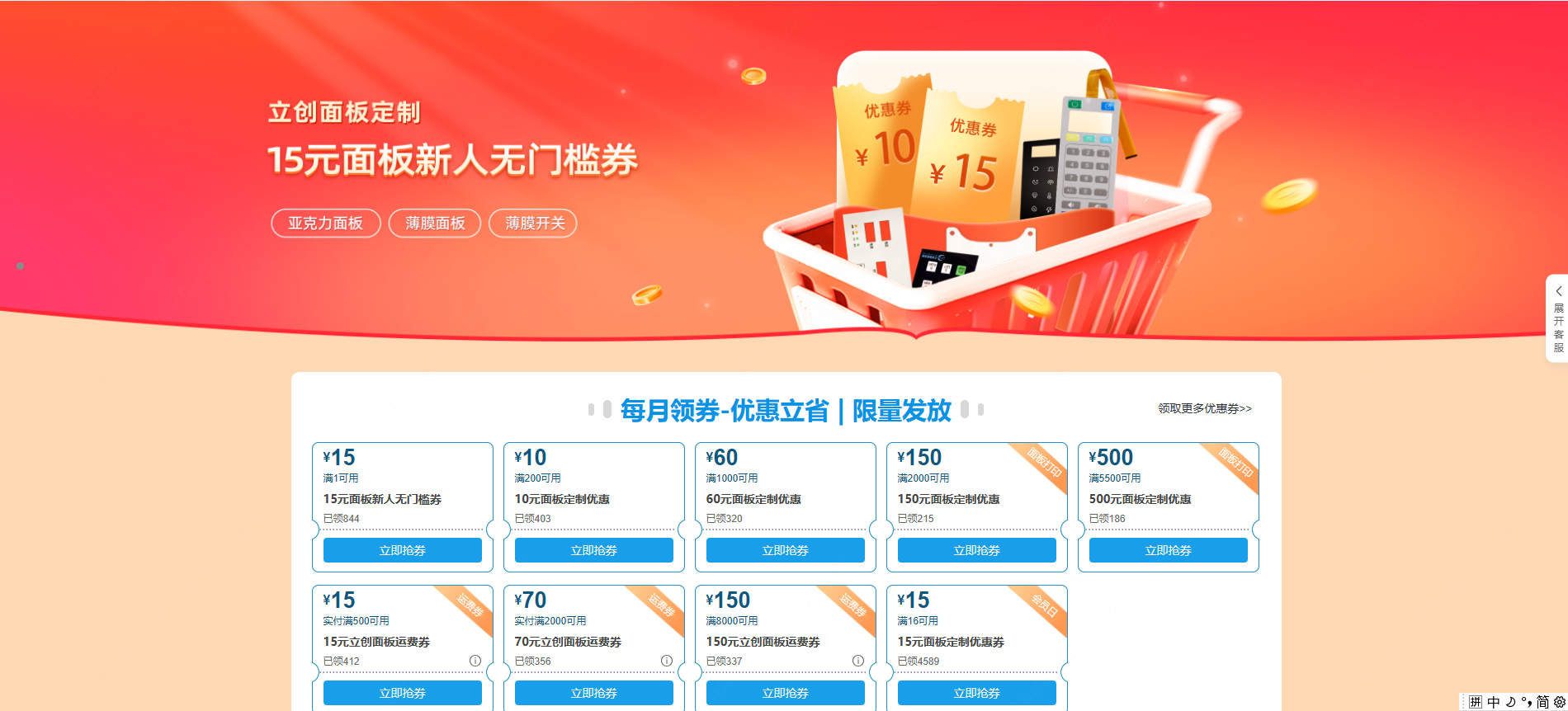 在立创面板-领券中心,每月都有丰富的优惠券、运费券等你来领!买的多,省更多!