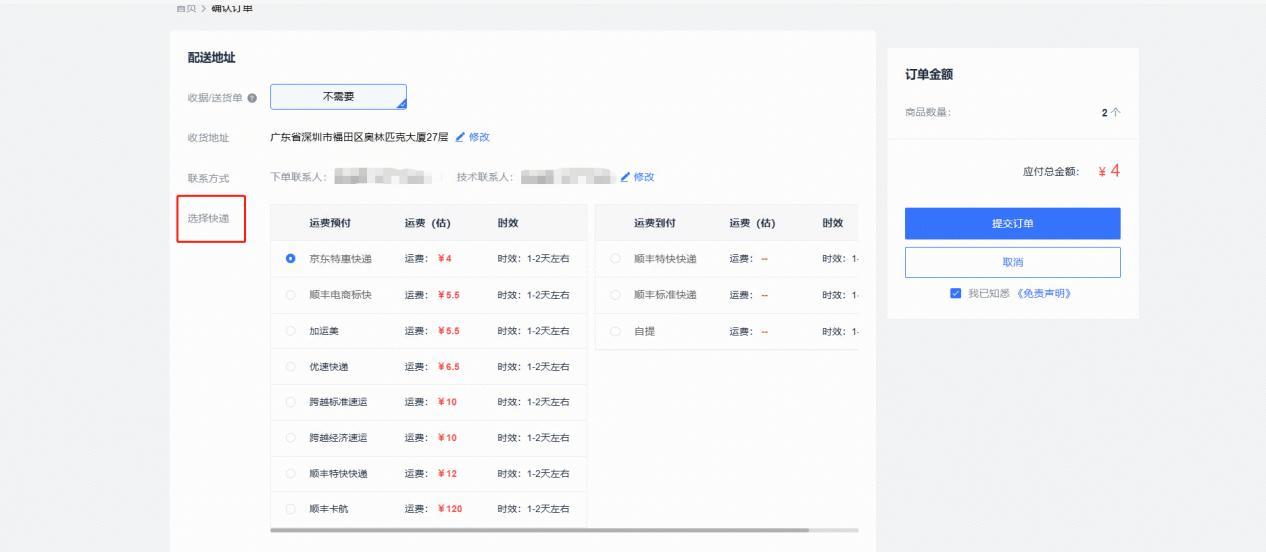 2、选择好所需尺寸后,点击【立即购买】,跳转到信息核对页面。根据您的紧急程度,选择合适的快递方式。