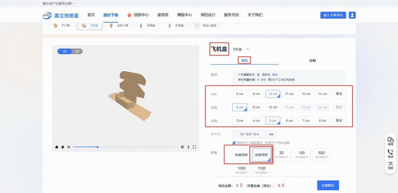 定制领样是我们在原有领样方式基础上的升级版本。目前仅支持盒型为飞机盒的定制(平口箱及其他盒型暂不参与定制领样活动),客户可从符合范围的任意现货规格尺寸中选择,仅需支付运费。具体操作步骤如下:
