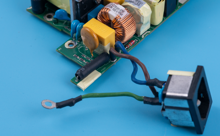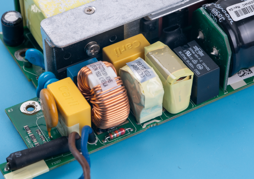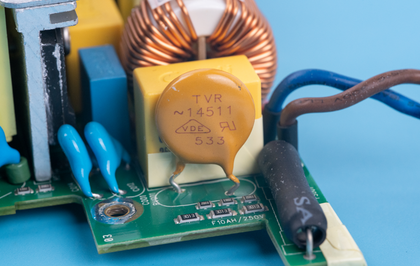 躺在板子上的黑色柱体是保险丝,黄色的TVR14511是压敏电阻,后面黄色的方块是安规电容。