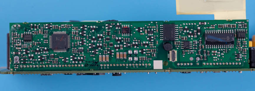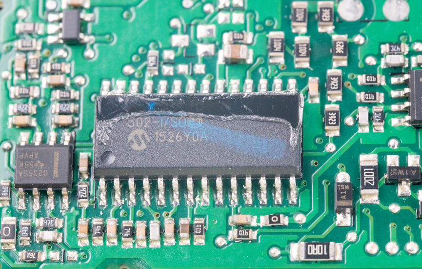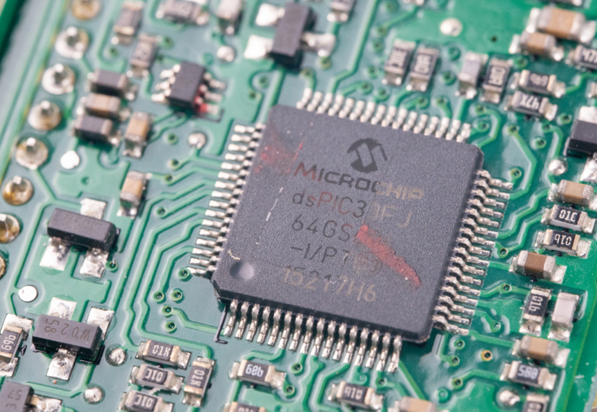 找个角度看清楚型号是DSPIC33FJ64GS606T-I/PT。这是一颗DSP芯片,原装芯片的价格大概在35左右,基本上能顶上整个把手电源模组的价格了。