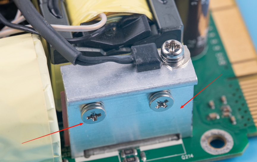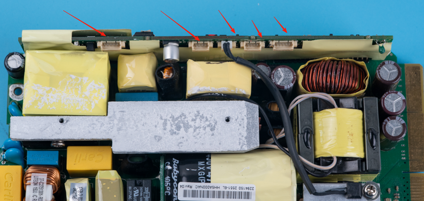再往后还有共模滤波电感、12V稳压模块等等。背后装了散热片这个黑色的器件,是D25XB100,是一个整流桥。
