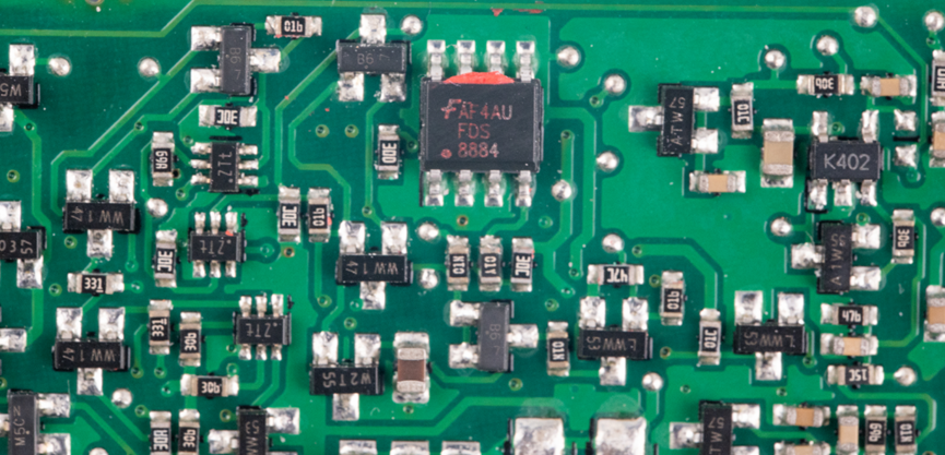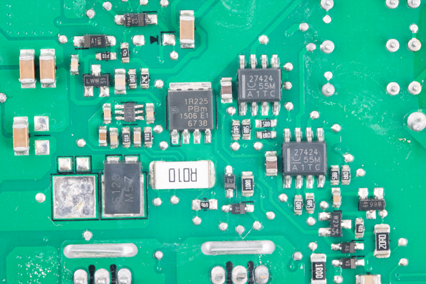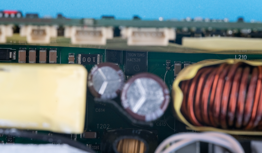 从林立的插件缝隙看进去,可以看到底板上还有一些贴片器件,比如这个英飞凌的MOSFET ,型号是BSC190N15NS3G,耐压150V,连续导通电流50A。