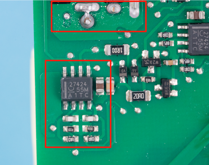 这边还有一个UCC27424DR,它驱动的两颗MOS就是正面加了散热片和NTC测温的MOS管。