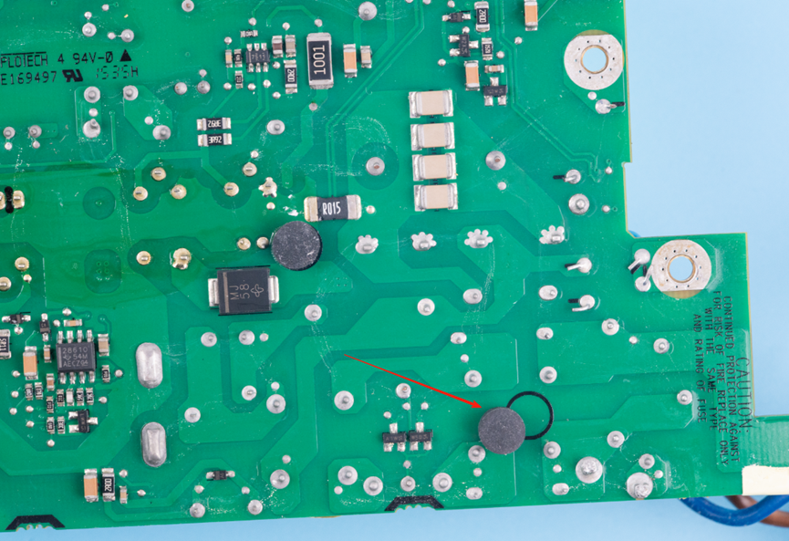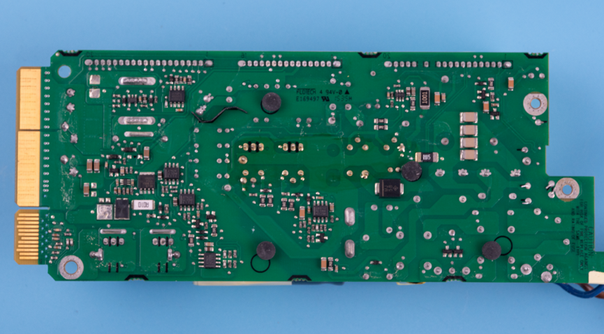 输入端的布线,基本上都是通过铜皮直接走的,只有信号线是拉线的。板子上有一些橡胶圆形垫片,但是很明显有一个贴偏了。看板子上的丝印,生产周期是14年第35周。