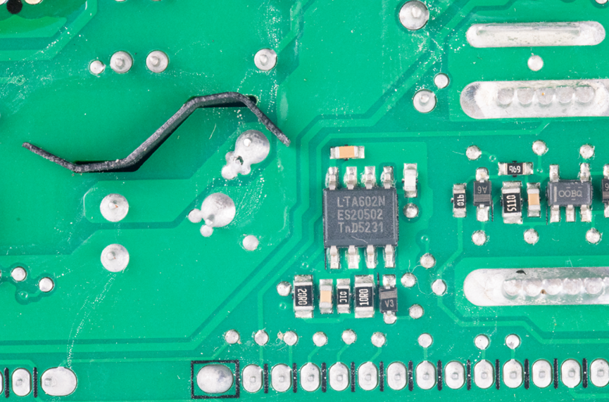 板子在需要隔离的位置,开了槽,然后插入了一个较厚的麦拉片。另外,这里有一颗疑似电源芯片的器件,型号是LTA602N。