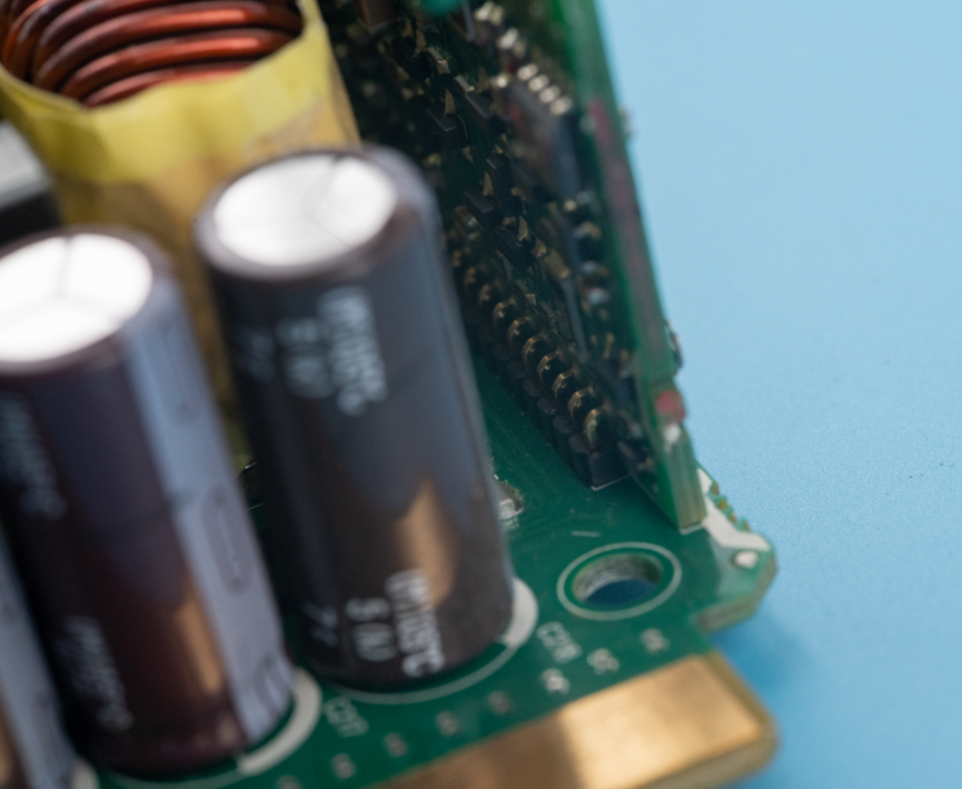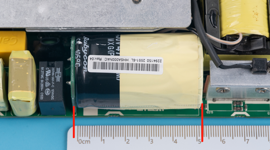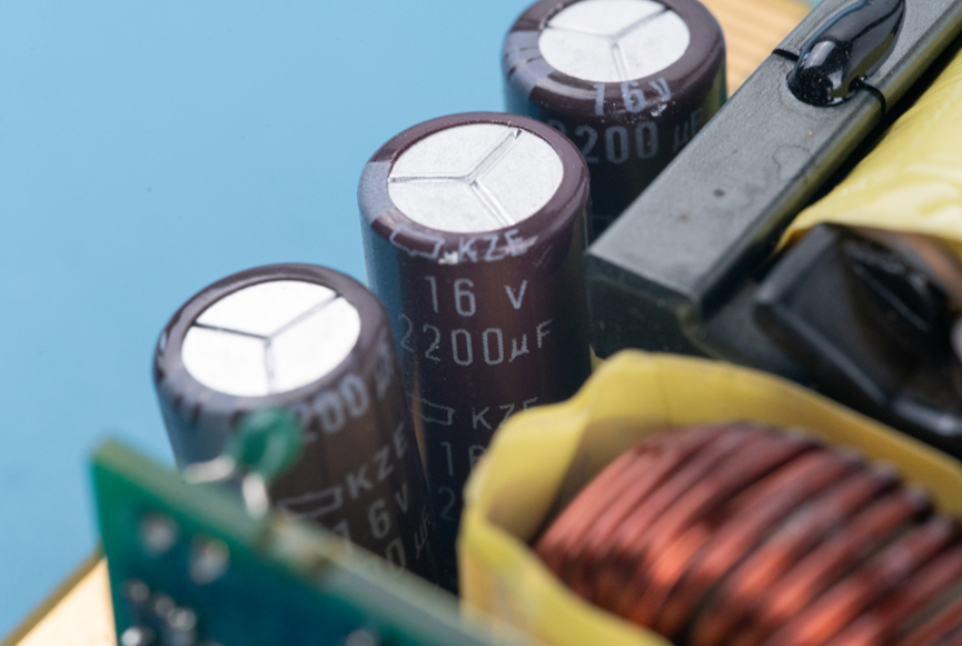这里塞了一个长度超过50mm的大电解电容。电解电容先焊接到一个小板子上,然后小板子竖着焊接在底板上。