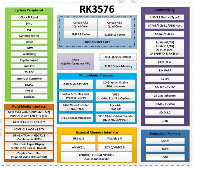 ROCKCHIP 八核 RK3576 四核 A72+ 四核 A53 , 搭载Android/Linux+QT/Ubuntu 系统, A72 主频 2.3GHz , A53 主频2.2G,采用 Mali-G52 MC3 GPU,内置 6T 算力 NPU,内存最大支持16GB,支持市面上通用显示屏接口,支持多屏异显,主板接口丰富。