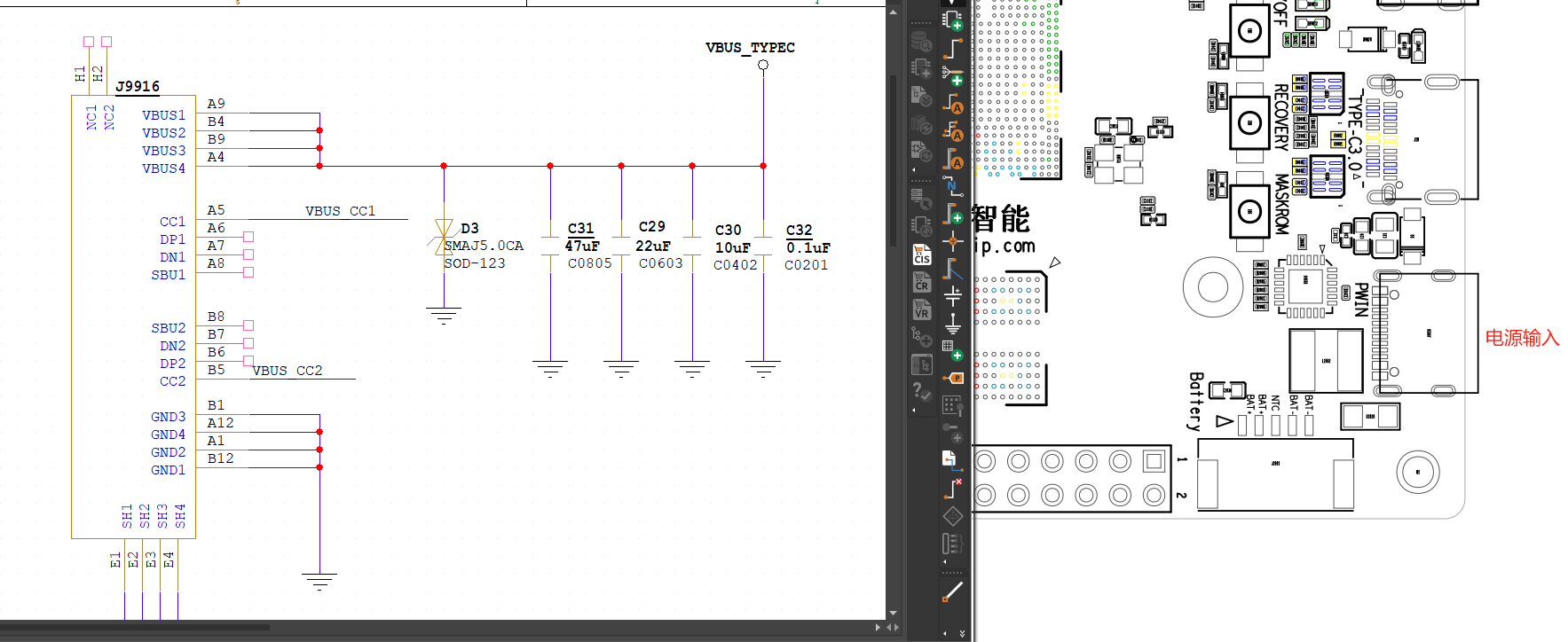 DC5V/3A从typec接口输入,预留了浪涌保护二极管D3,储能电容C31 C29和滤波电容C30 C31