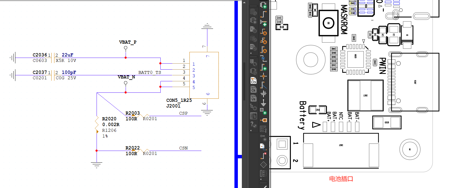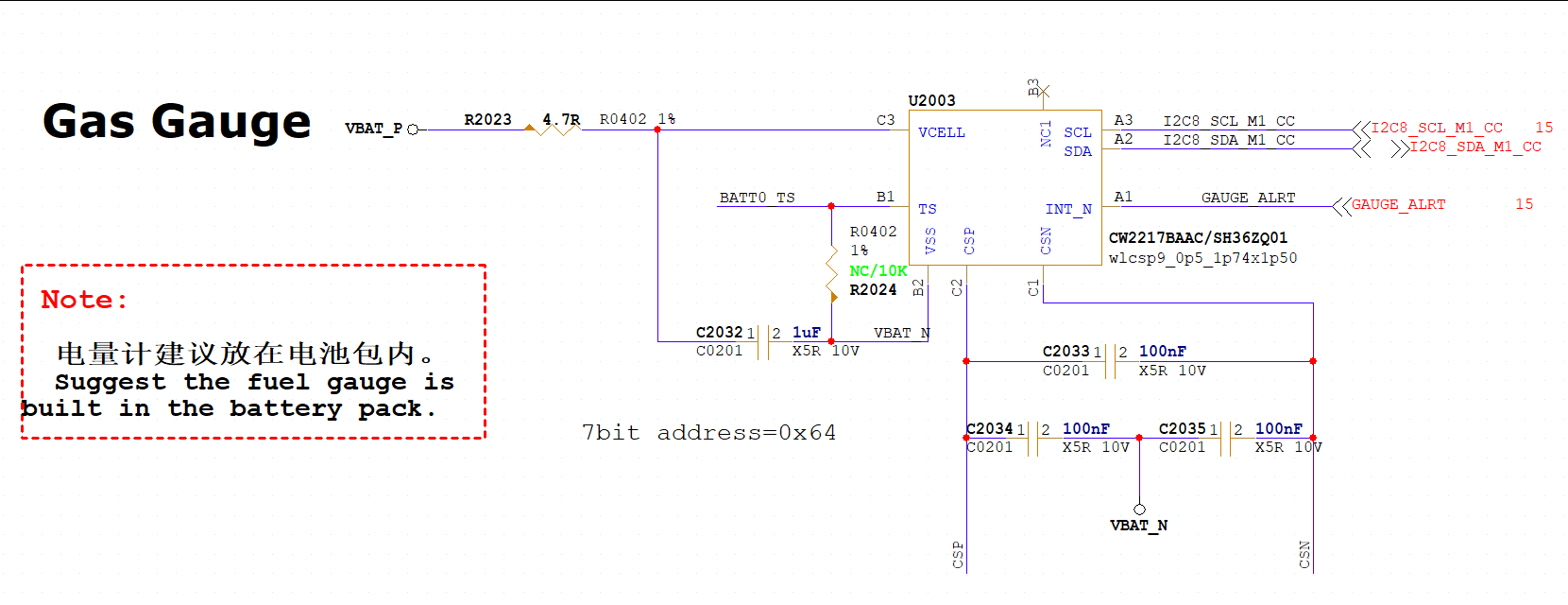 电池增加温度检测功能,电量计通过检测R2020两端的电压计算出电量大小,CSP和CSN应按照差分信号走线。