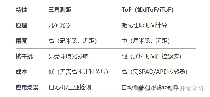 前天发了一个小米扫地机激光雷达拆解(20元淘个小米扫地机激光雷达,拆解发现转动部分信号),文章发布之后,有好几个大佬在留言区纠正了我文章中的错误:这种激光雷达用的测量原理不是TOF,而是三角测距原理。简单来说就是不同距离的目标,其发射回来的光,打在CMOS传感器上的位置是不一样的。下面是三角测距原理和TOF测距原理的区别与比较。