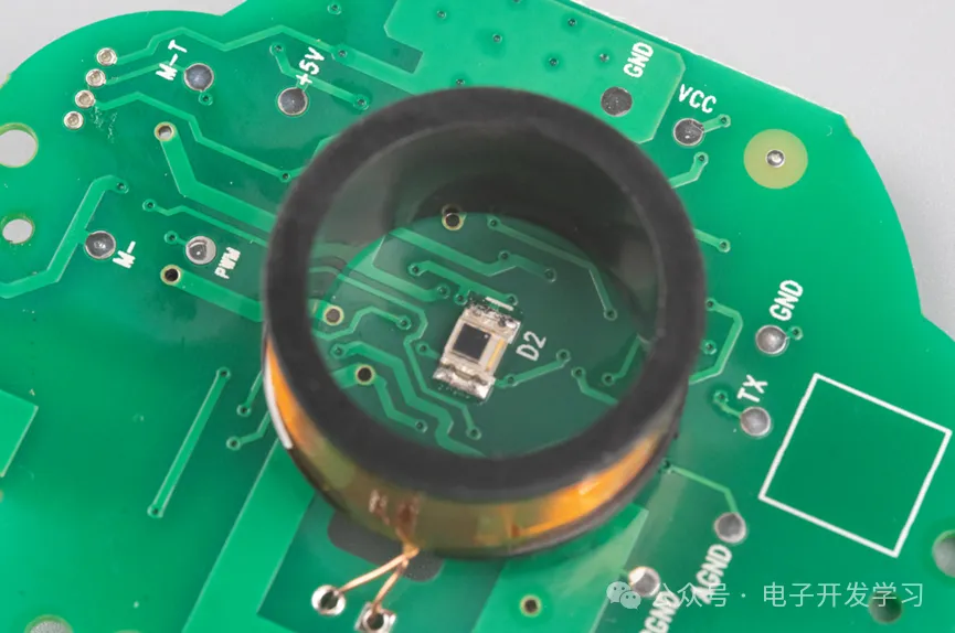 这个是一个光电编码器。也就是说这个丝印C14J的器件,它的功能是处理编码器输出,根据丝印可以查到这个芯片是SN74LVC1G14DBVR,单通道施密特触发器。