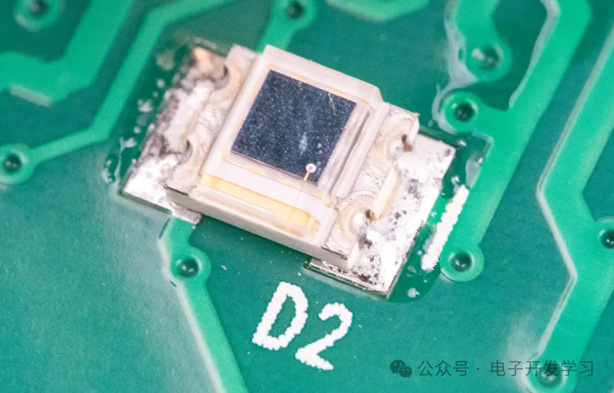 这个板子另外一边是电源整流电路,先把传输过来的交流电通过四个二极管整流,然后稳压之后给激光发射和激光接收供电。右边的丝印DE=33X的封装SOT23-5的器件,闭着眼睛猜应该是一个3.3V输出的LDO。上面还有一个丝印C14J的封装为SOT23-5的器件是做什么的呢?看看它的第二脚连接到一个通孔引脚了,这个引脚刚好是下面这个器件的四个引脚之一。