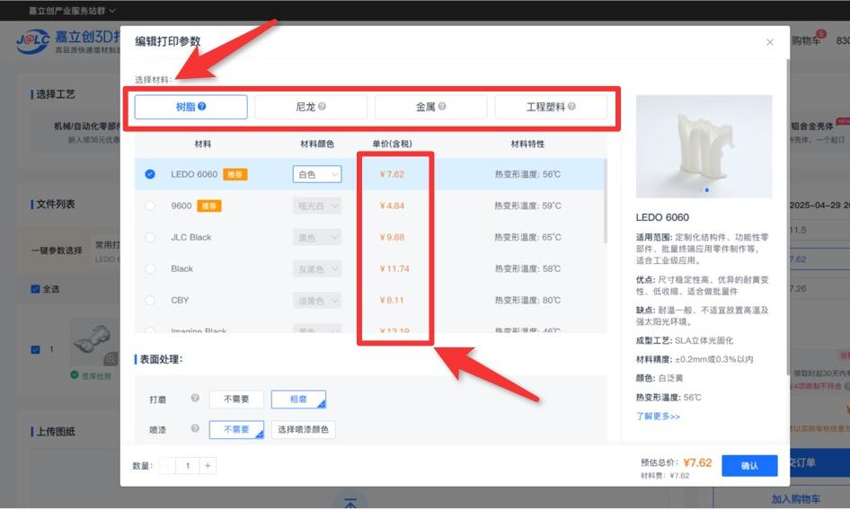 第三,价格透明化——树脂、尼龙、金属、塑料等20+材料,连附加费用都在页面直观展示,只要切换不同材料就能实时查看价格差异,方便你对比和决策;