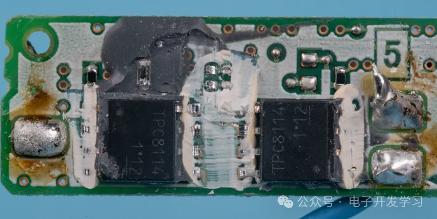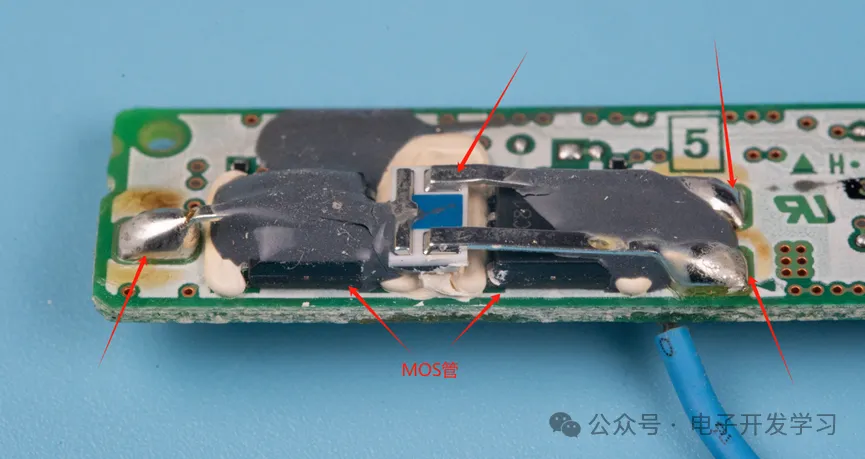 另一个我比较好奇的点是,板子的另一端,两个MOS管上面有一个三端子器件,这个器件跨在两个MOS管上面。我的猜想是,这是两个NMOS,背靠背放置在电池的输出电路上。而这个横跨在两个MOS上面的三端子器件,应该是一个温度敏感的器件,如果检测到两个MOS温度过高,就会通过一定的机制让MOS停止导通。
