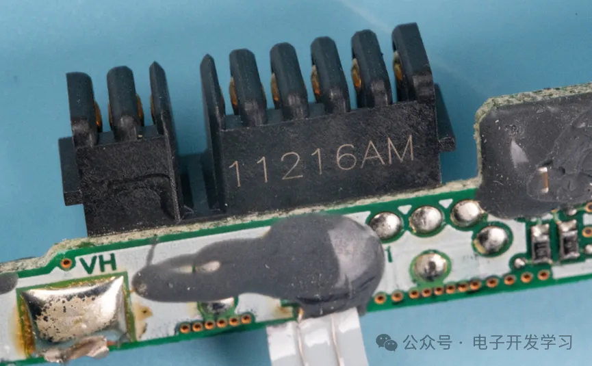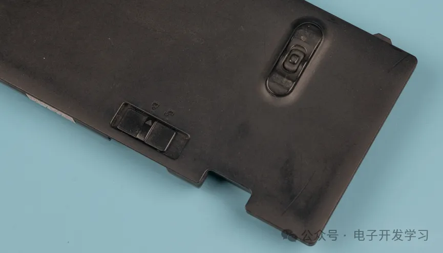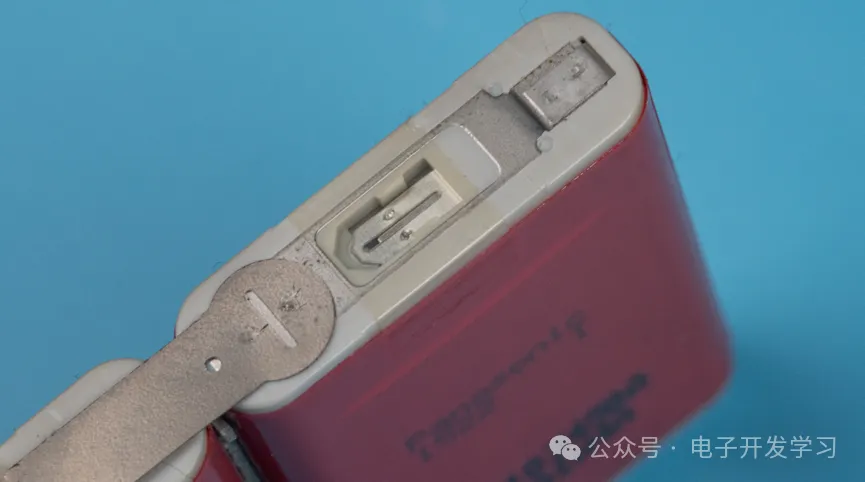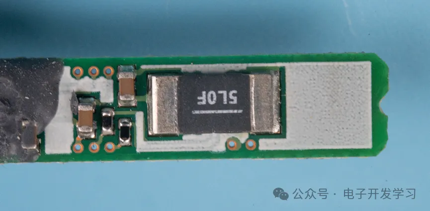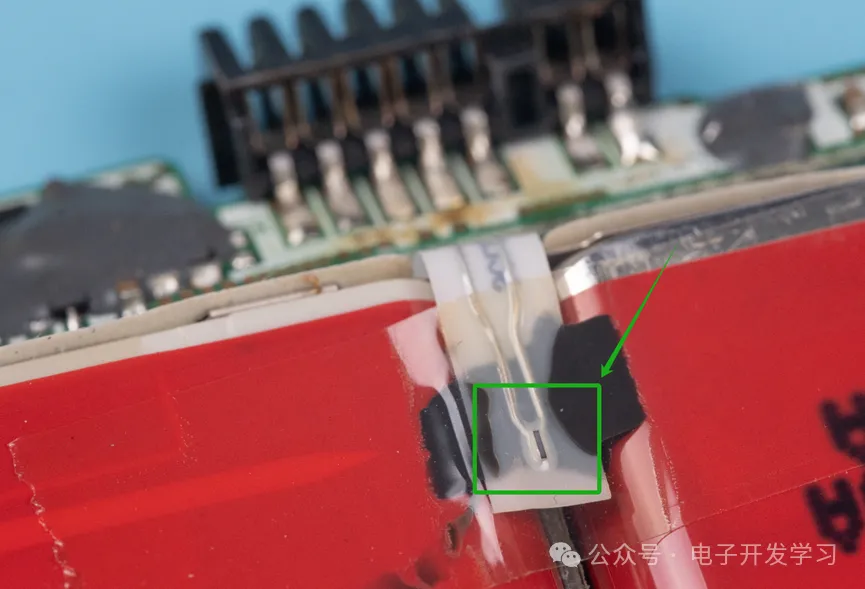 在两个电池的缝隙中有一个NTC热敏电阻,这个和之前拆解的血糖检测仪非常相似。
