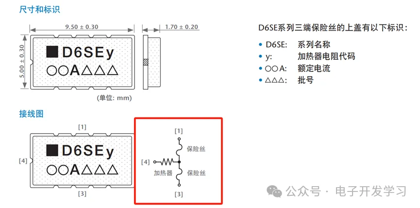 果然没猜错,这是一个来自德国肖特的三端子表贴保险丝,我没找到D610的资料,只找到了D6S系列的手册,可以参考一下。它的作用就是在过热的情况下切断电路来防止起火。这样就可以让电池在安全的情况下放电,避免过流、过渡充电、过渡放电。