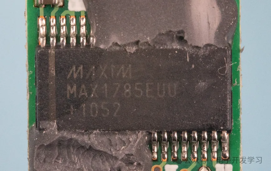 板子上还有一颗美信的芯片,型号是MAX1785EUU,这是一个智能电池组控制器,集成了8bit的MCU、库仑电量计、多通道数据采集单元。