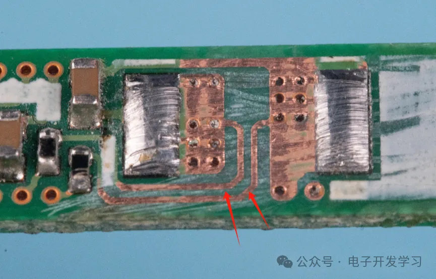 为了看得更清楚,我打磨了白色丝印层和绿油层,可以看出,在电阻焊盘上,往内延伸了一定长度的铜皮,然后采样信号走线从中间引出之后,两根线靠近然后引走。果然是走量特别大的产品里的布线,非常规范。