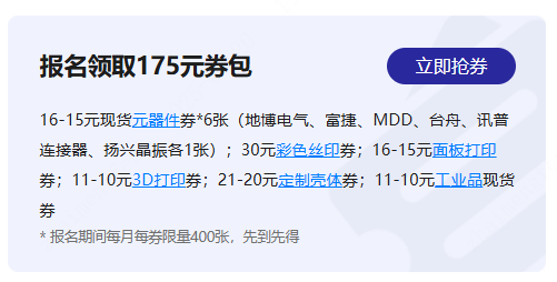 报名即可解锁元器件券、彩色丝印券等价值175元券包,覆盖设计、打样、物料采购等环节,助你零压力开干。