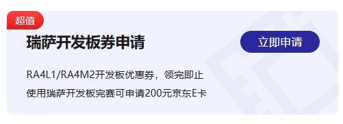 报名即可申请瑞萨RA4L1/RA4M2开发板优惠券,使用瑞萨开发板完赛可申请200元京东E卡,先报名先锁定福利。