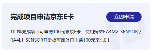 完成项目后,你还可直接申领100元京东E卡,使用瑞萨RA4M2-SENSOR/RA4L1-SENSOR开发板创作项目,额外再拿100元京东E卡!