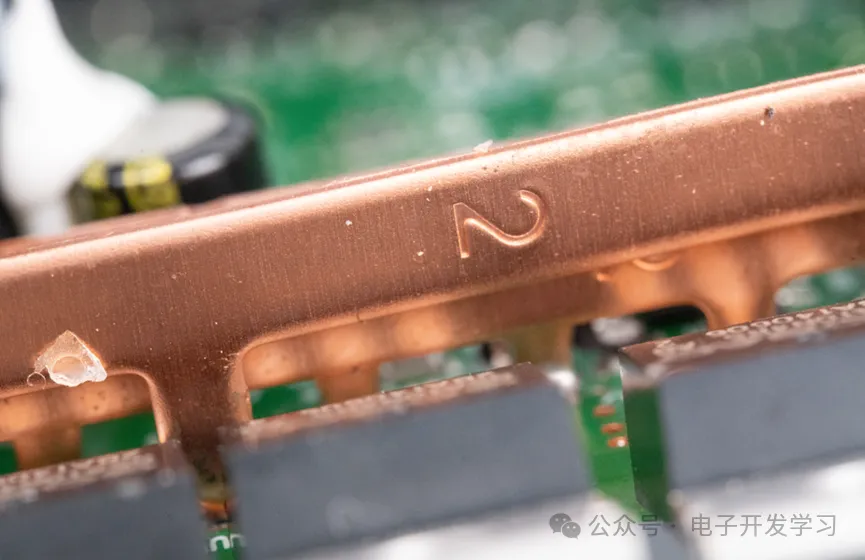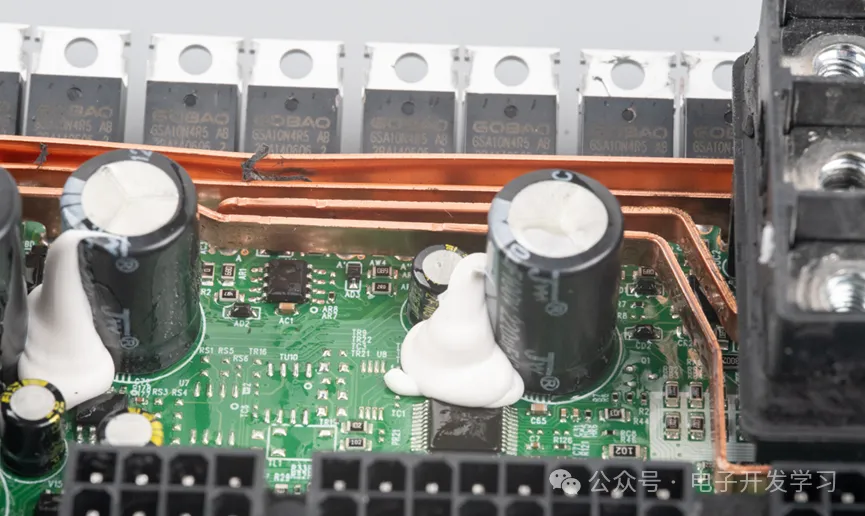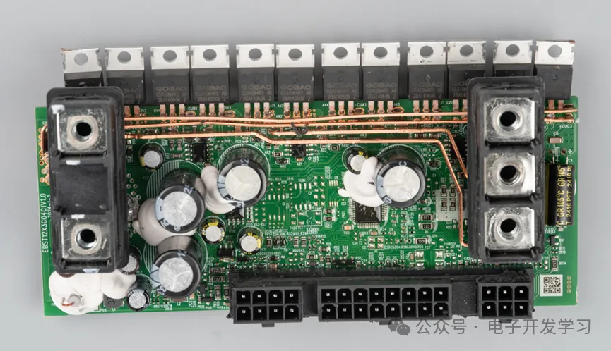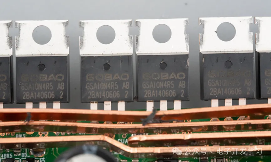 总共用了12颗MOS,型号是GSA10N4R5,根据型号来看,这个MOS的电压是100V,导通阻抗4.5毫欧,看Logo也是高标的,不确定是定制还是自研型号。