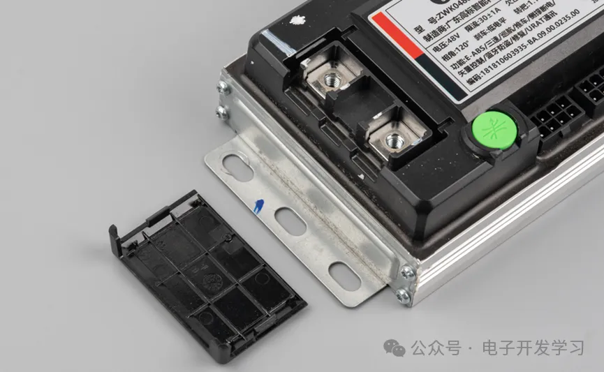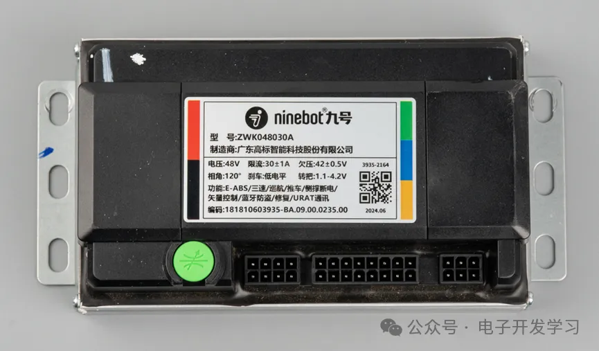 今天收到了粉丝寄来的一个九号电动车原装驱动器。由于这个原装驱动器持续电流只有30A,峰值也只有40A,爬不动坡,所以被换下来了。这个电驱的型号是ZWK048030A,制造商是高标。出厂日期是2024年6月的,算是比较新的了。