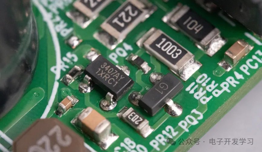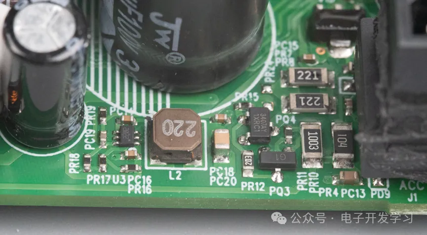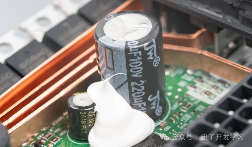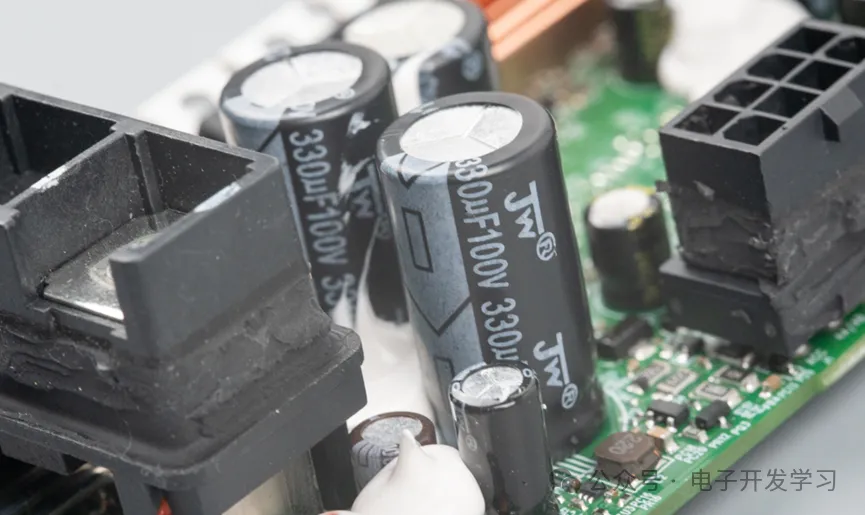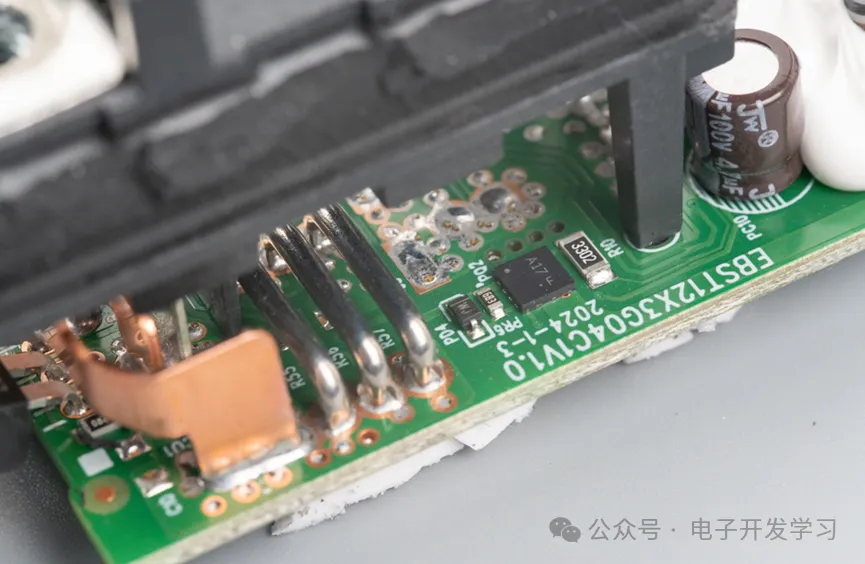 母线输入电容是两颗100V330uF的点解电容。这个电解电容的品牌有大佬认识的话,欢迎在评论区留言告知。