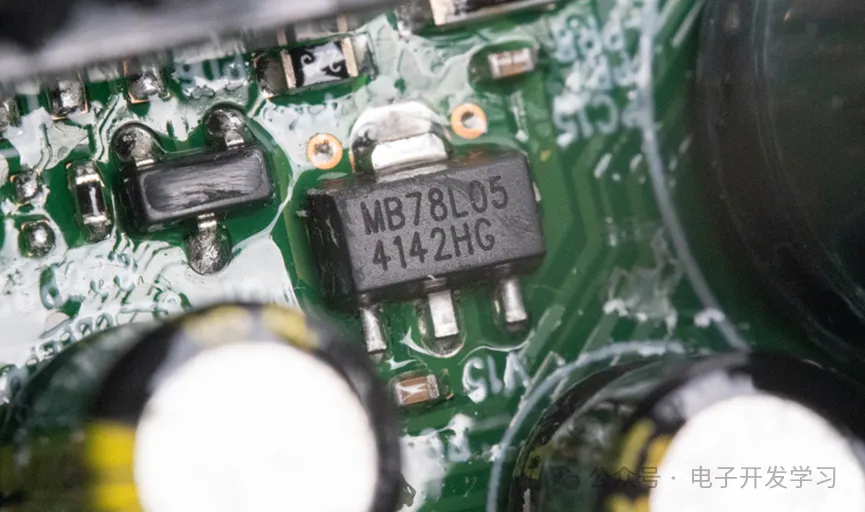 一堆点解电容里隐藏了一个LDO,型号是MB78L05。