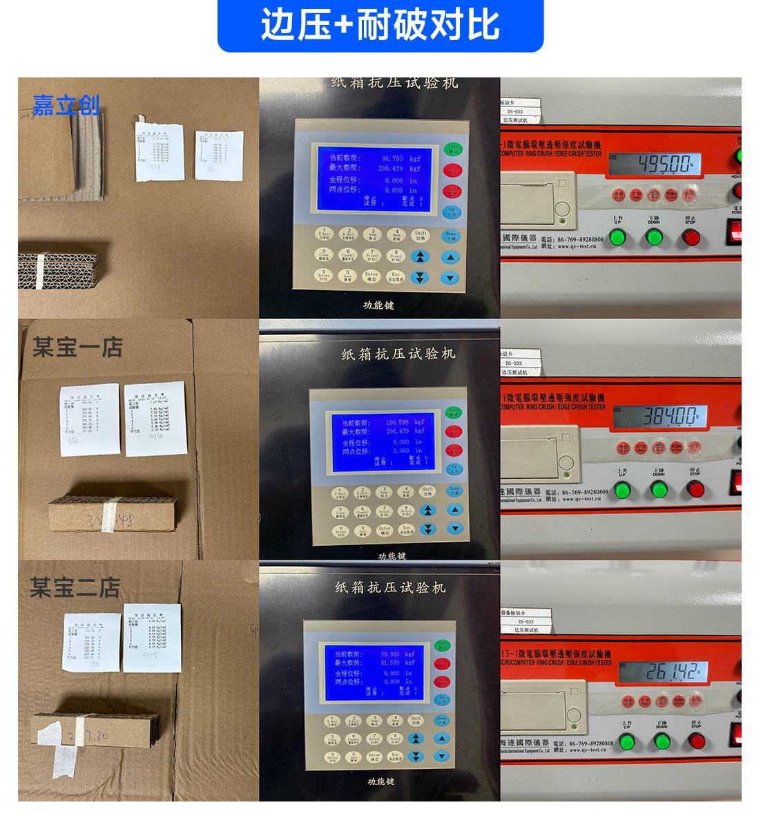 通过专业设备检测,如图所示,嘉立创纸盒耐破和边压值表现出色(检测时由于嘉立创所用纸箱经过了防水测试,干燥纸箱边压检测值为635N,远远大于本次测量结果)。高耐破、边压能够有效抵抗冲击和堆叠,大幅降低物品运输中的破损率。
