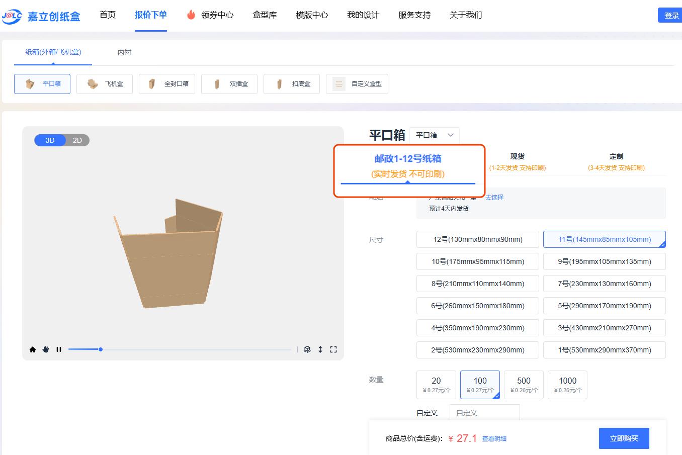 为此,在现货纸箱和定制纸箱的基础上,我们进一步上线了“邮政1-12号”平口箱,为用户提供更多选择。“邮政1-12号”现货纸箱采用与嘉立创PCB包装纸箱同款材质(优牛),确保品质上乘,下单后实时发货,快速响应用户需求。