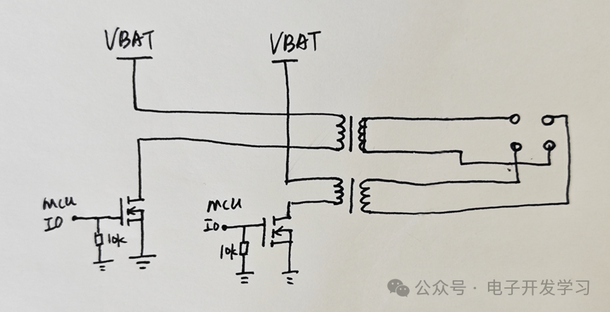 通过MCU来控制两个MOS有序导通,即可控制两个变压器的主绕组产生电磁场,电磁场耦合到来另外一个副绕组,如果匝数比足够大,那么产生的感应电压就会非常高,从而能够击穿空气,产生电弧。