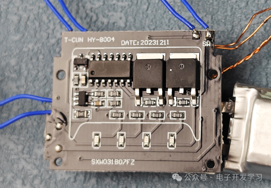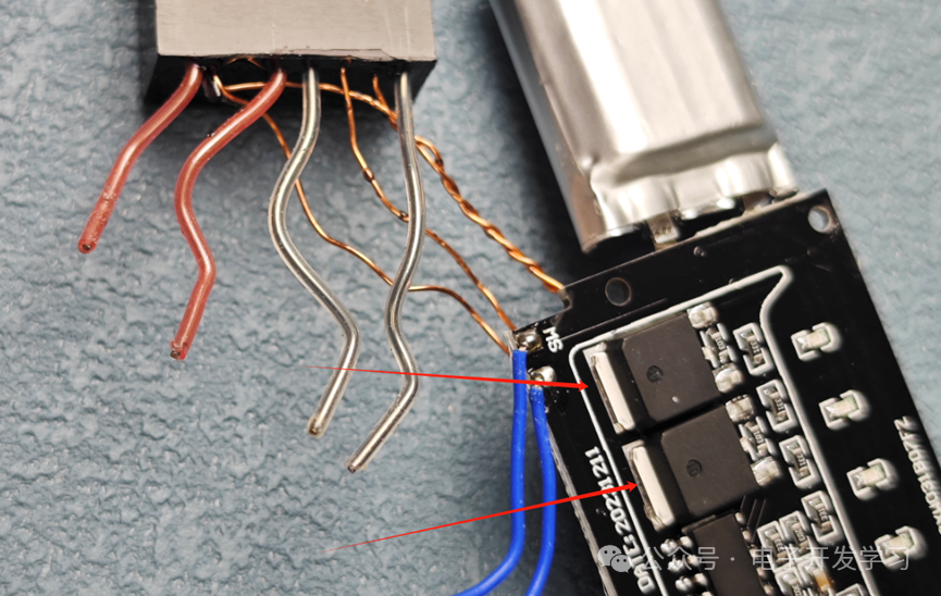 而那两块铜皮通过过孔连接到板子正面的MOS管的D极了。