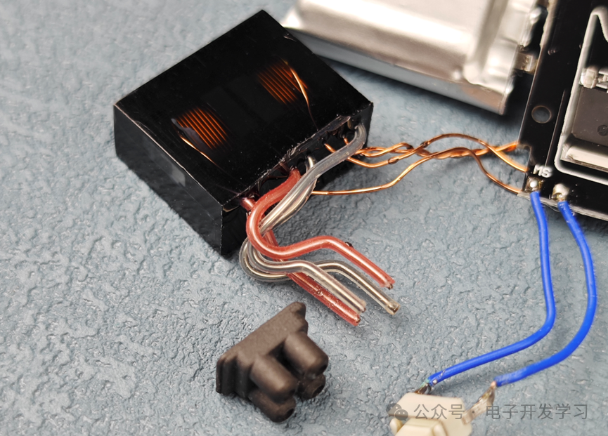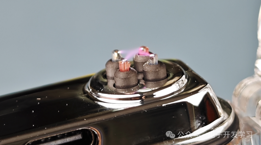 回到这个图,可以看到同一个绕组引出的线,分布在对角,这样就会产生对角线电弧,两个对角线电弧交叉,就是开始打着火之后的图案。另外,这个上面套的这个黑色小件,应该是陶瓷材质的,必须要能耐高温,且绝缘。
