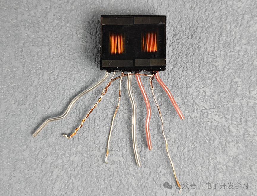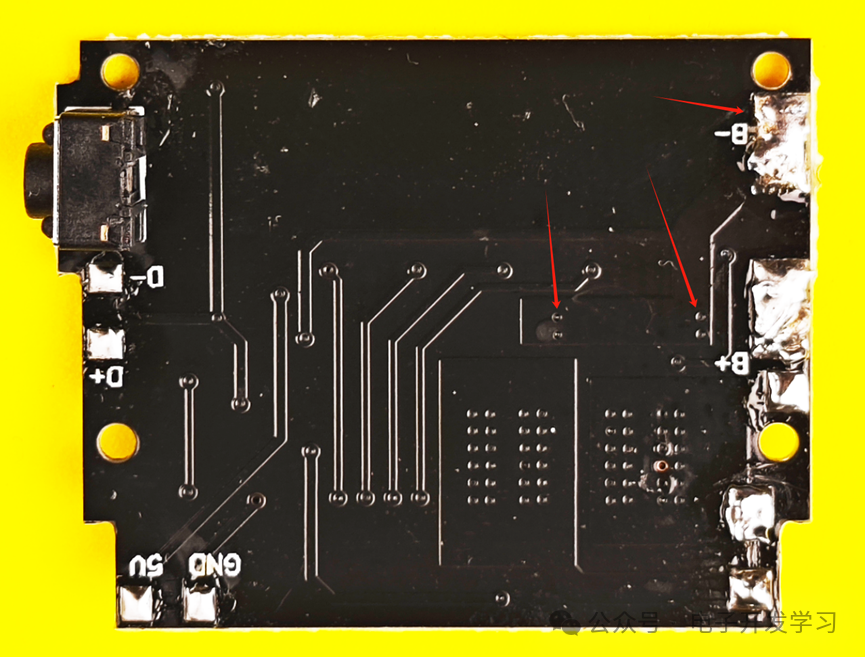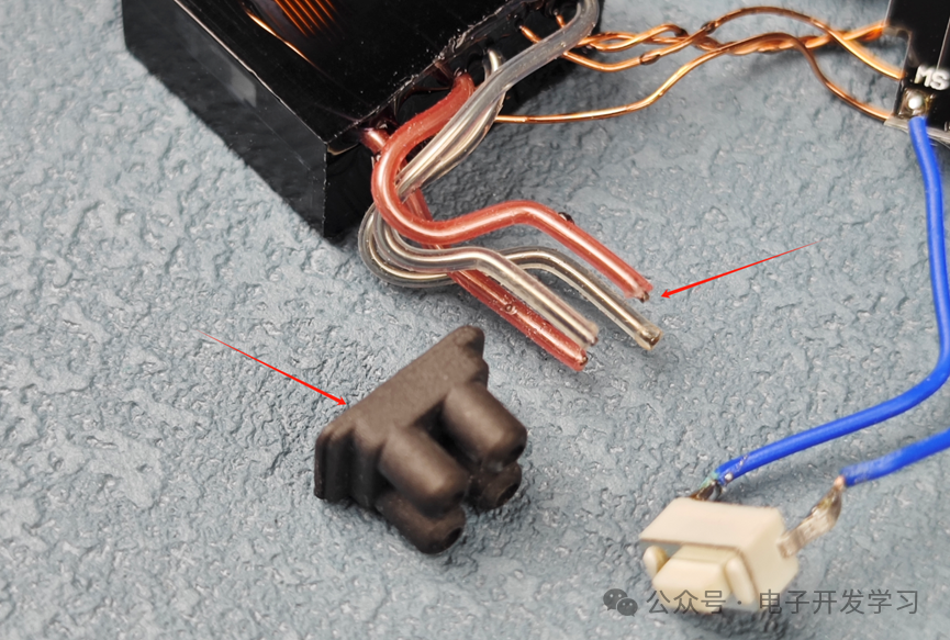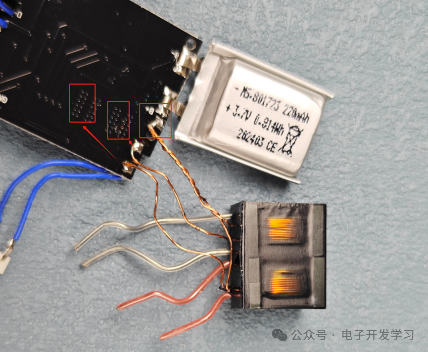 仔细观察这个电弧发生器,和电路板之间有四根铜线连接,两个绕组,每个绕组各有两根线,其中两个绕组各有一根线是拧在一起,焊在电池的正极了。另外各有一根线连接到这一堆过孔所在的铜皮了。