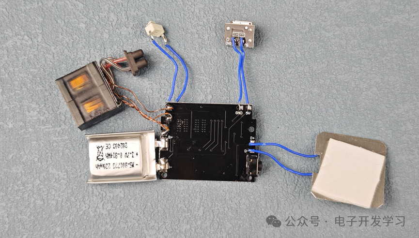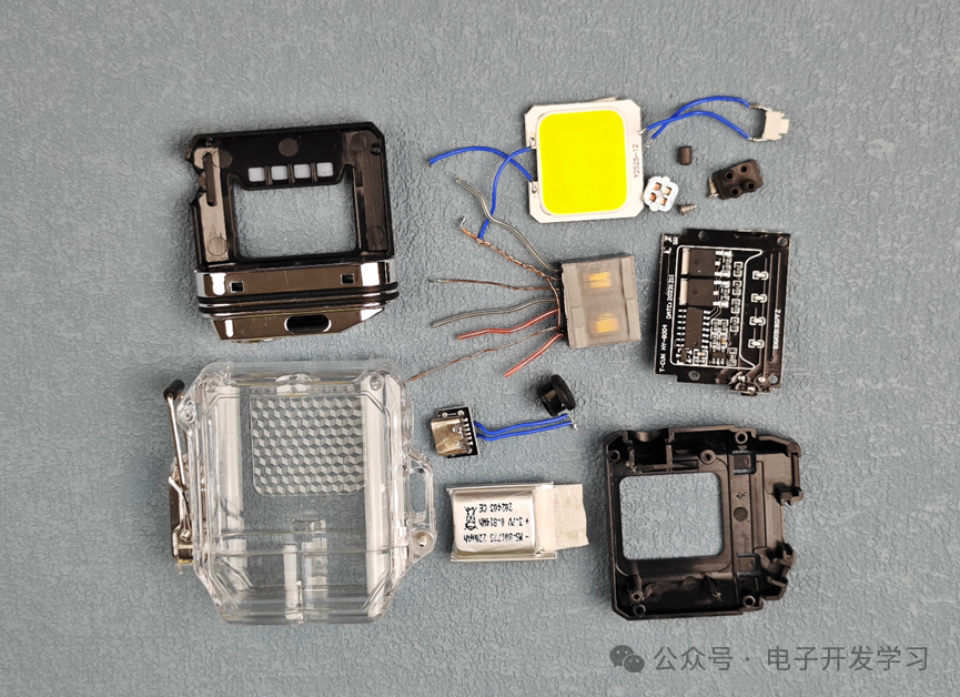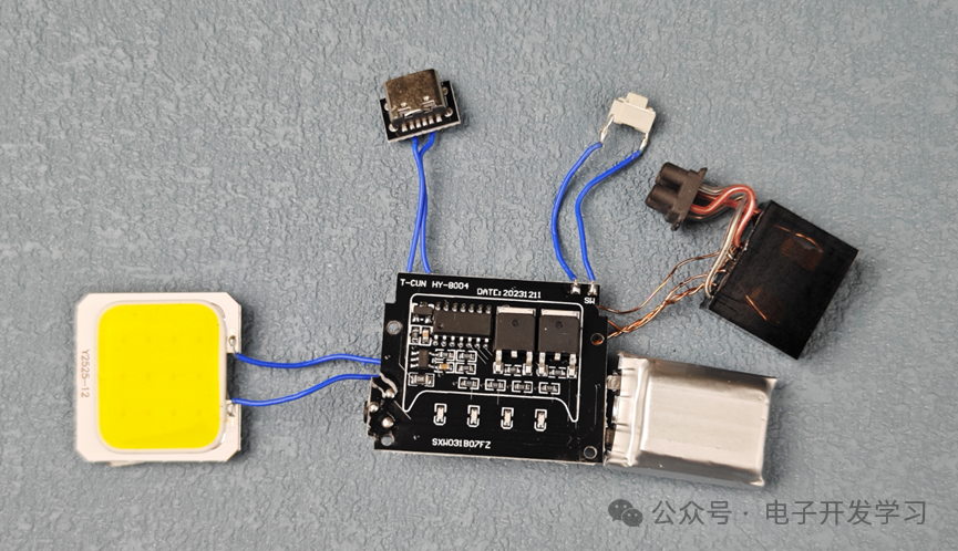 电路板也比较简单,单面板,通过导线引出了COB光源,Type-C充电接口,打火按键,高压电弧发生器、锂离子电池包等。